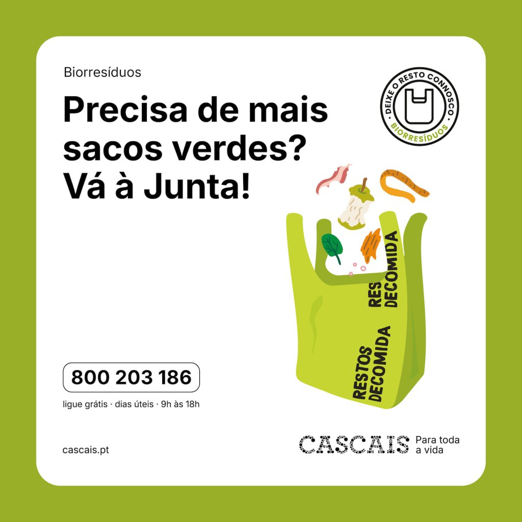 Se já aderiu ao sistema de recolha de biorresÃduos em sacos verdes, vai continuar a receber em casa, a cada dois meses, os seus rolos gratuitos. Se ainda não faz parte, ligue Linha Cascais 800 203 186