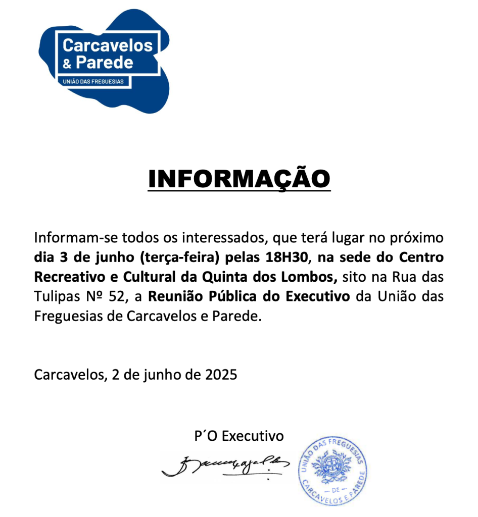 Informam-se todos os interessados, que terá lugar no próximo dia 3 de junho (terça-feira) pelas 18H30, na sede do Centro Recreativo e Cultural da Quinta dos Lombos, sito na Rua das Tulipas Nº 52, a Reunião Pública do Executivo da União das Freguesias de Carcavelos e Parede.