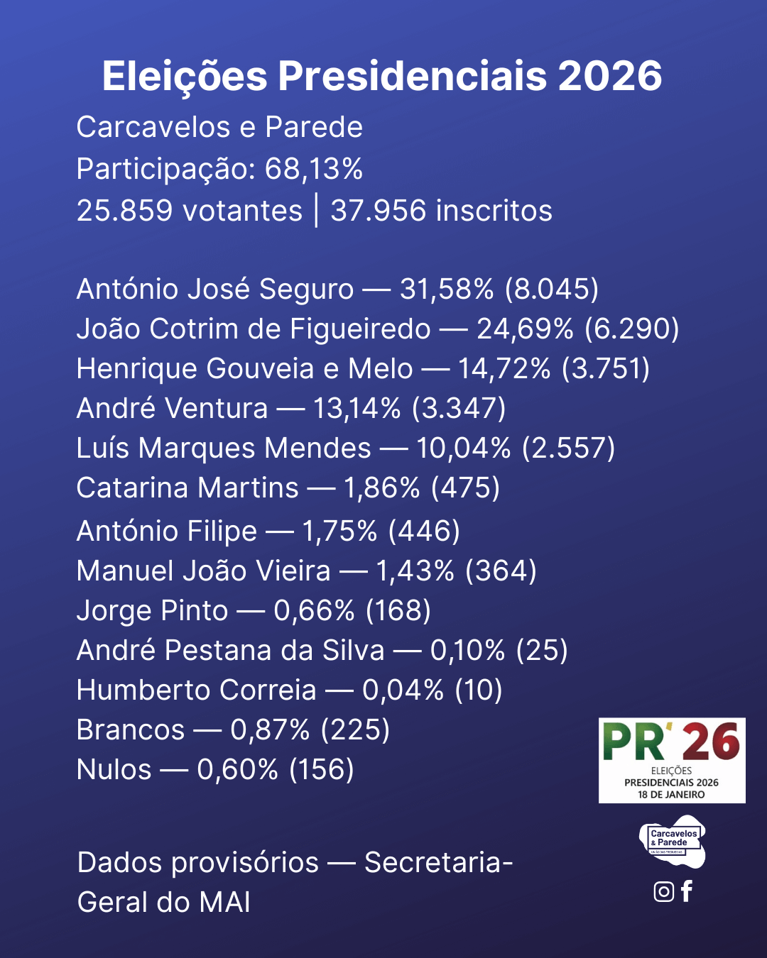 Eleições Presidenciais 2026 - Resultados provisórios em Carcavelos e Parede